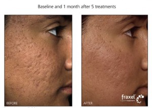 So how does the laser work? The Fraxel laser targets deep into the second layer of skin, known as the dermis, in order to stimulate new collagen growth. This collagen helps to firm up your face. This new skin formation helps overpower older, flawed skin, including wrinkles, fine lines, acne scars and pigment discoloration.