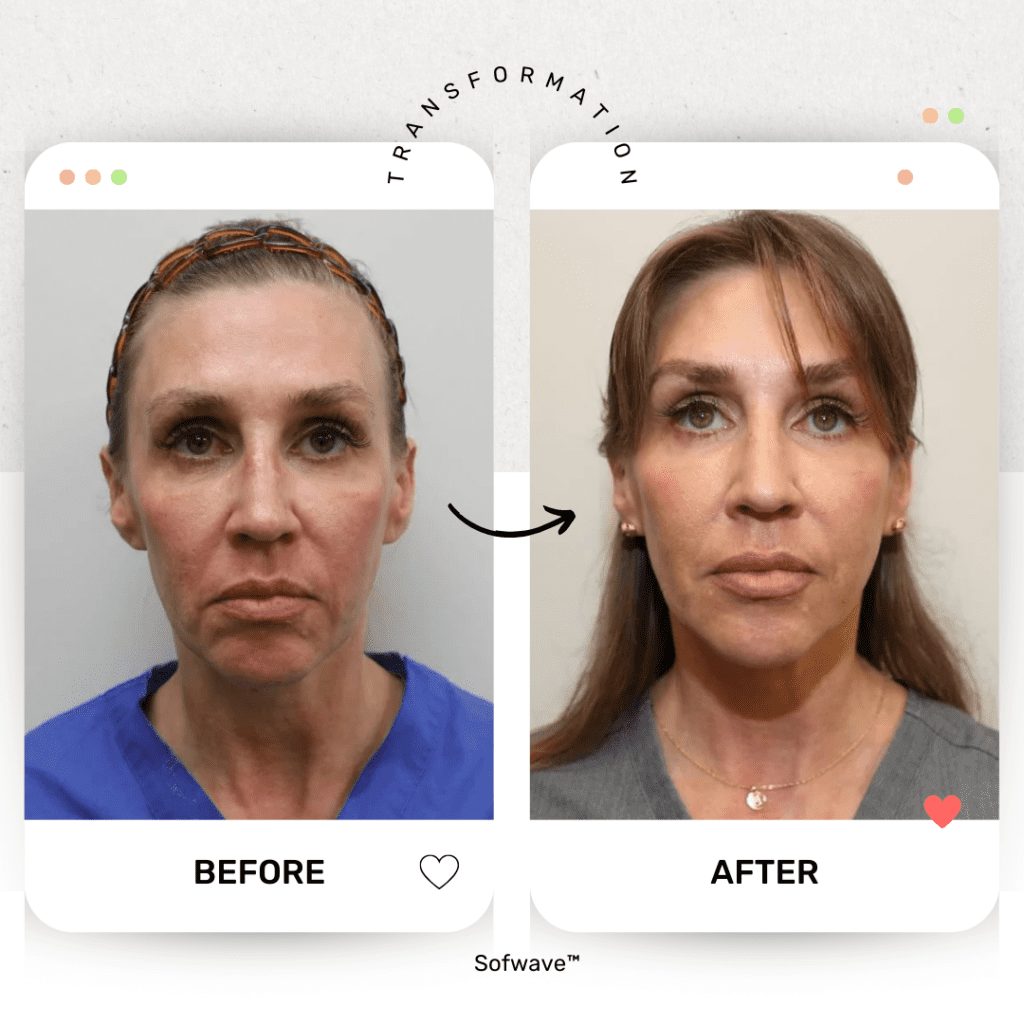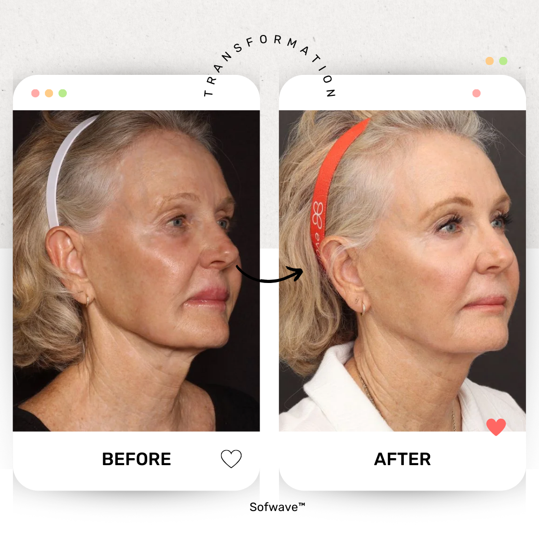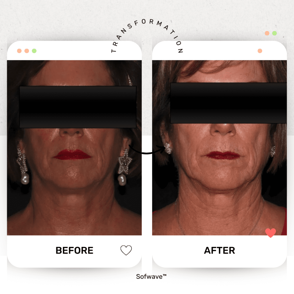 As we age, collagen and elastin depletion leads to wrinkles and loss of skin elasticity. Sofwave™ offers a clinically proven, non-invasive solution to remodel collagen, providing remarkable improvements in facial lines, wrinkles, and a lifting effect on the eyebrows, neck, and submental region.